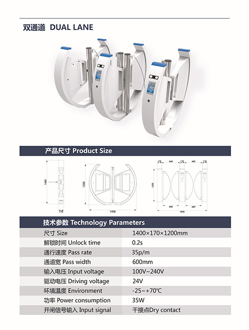 R3012 1.尺寸: 1400x170x1200mm 2.解鎖時間: 0.2s 3.通行速度: 35p/m 4.通道寬: 600mm 5.輸入電壓: 100v~240v 6.驅(qū)動電壓: 24v 7.環(huán)境溫度: -25~+70℃ 8.功率: 35w 9.開閘信號輸入: 干接點 10.產(chǎn)品包裝: 紙箱+珍珠棉 11.產(chǎn)品型號: R3012